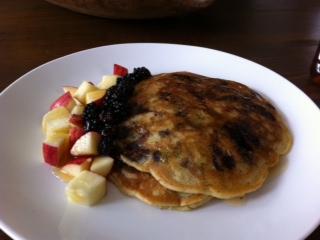 Here's the finished pancakes served with apple, Sweet Freedom and some blackberries that we foraged down near the beach.